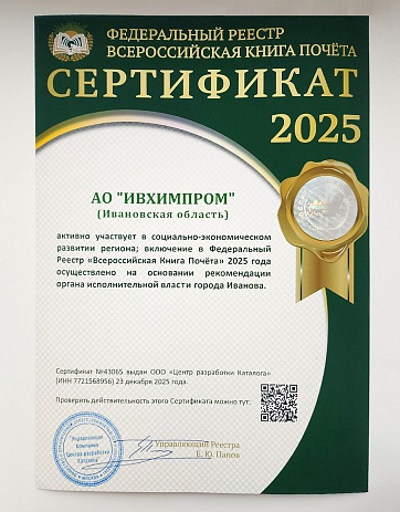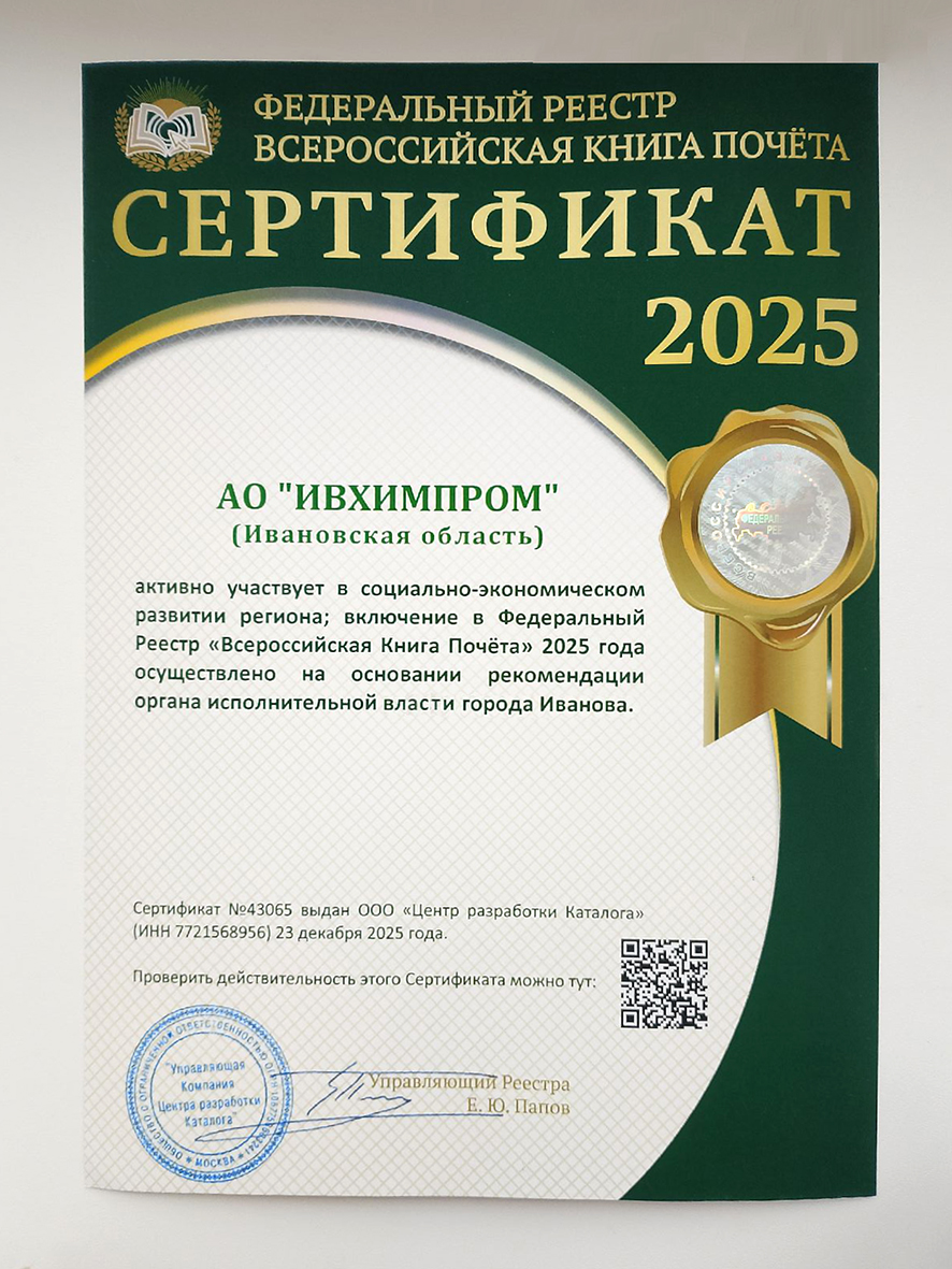 За активное участие в социально-экономическом развитии Ивановской области АО ИВХИМПРОМ включено в Федеральный Реестр "Всероссийская Книга Почёта"